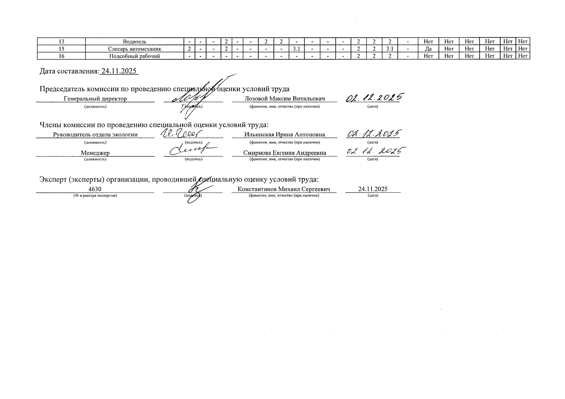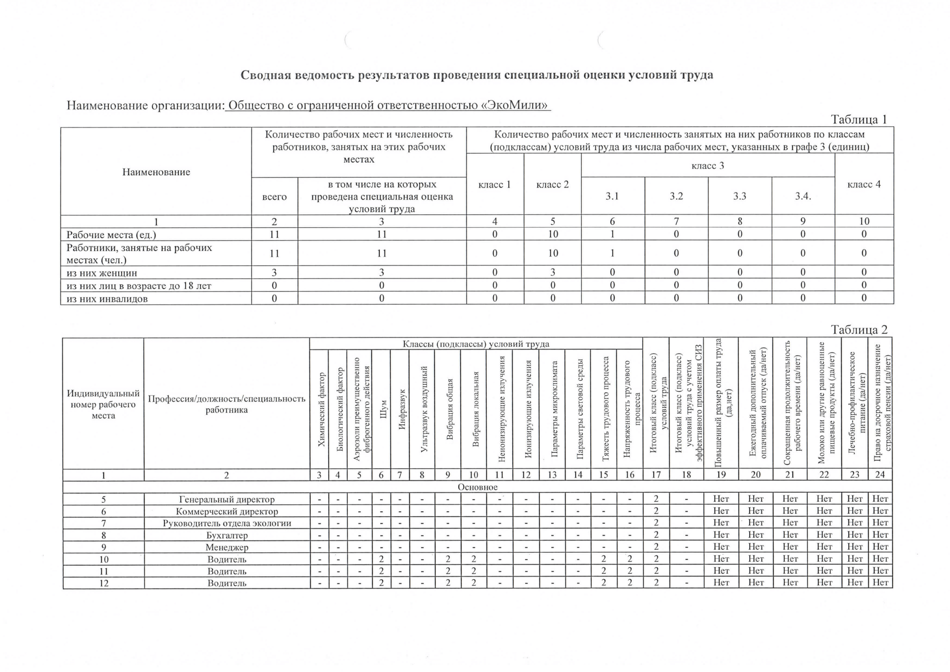 Данные о результатах специальной оценки условий труда